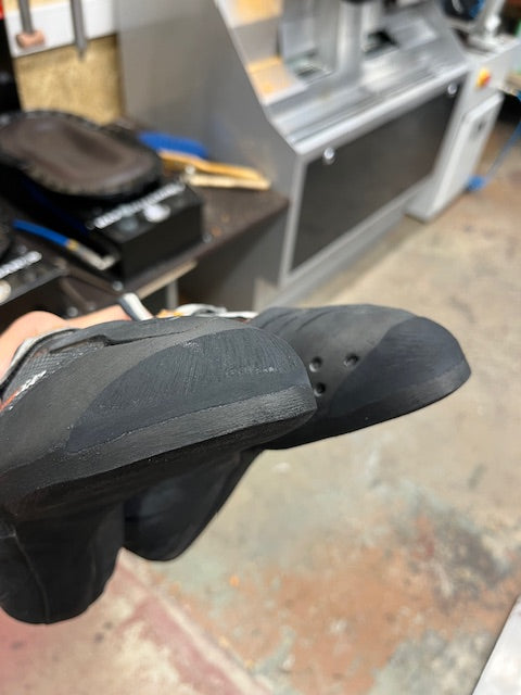 Jos kiipeilykenkien kärjet ovat kuluneet puhki tulee niihin laittaa kärkipaikka. Käytämme kärkien korjaukseen Vibramin Bordol 1,5mm paksua kumia.